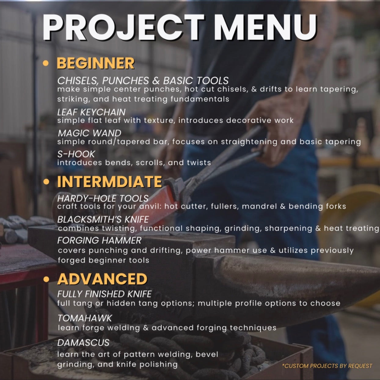 For the first several of sessions, students focus on building a strong foundation: learning proper forging technique, heat control, safety, and shop awareness. Once a student is confident and ready, they’ll gain access to a project menu with beginner, intermediate, and advanced items.